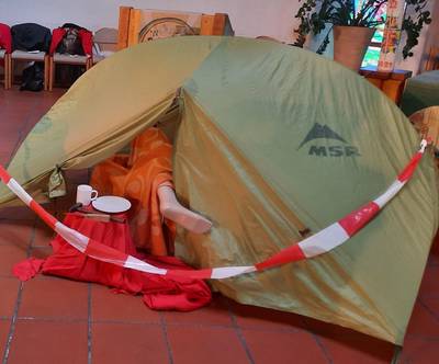 Diakonin Apel hängt den Talar an die Garderobe. Während die Musiker sich einstimmen, stilecht im entsprechendem Outfit, kommen Brigitte Mangold, Christa Grasmück, Ulrike Pauli und Ursula Weisbrod. Sie bauen die Requisiten auf: den Schreibtisch fürs Kommissariat, das Zelt für den Tatort.
