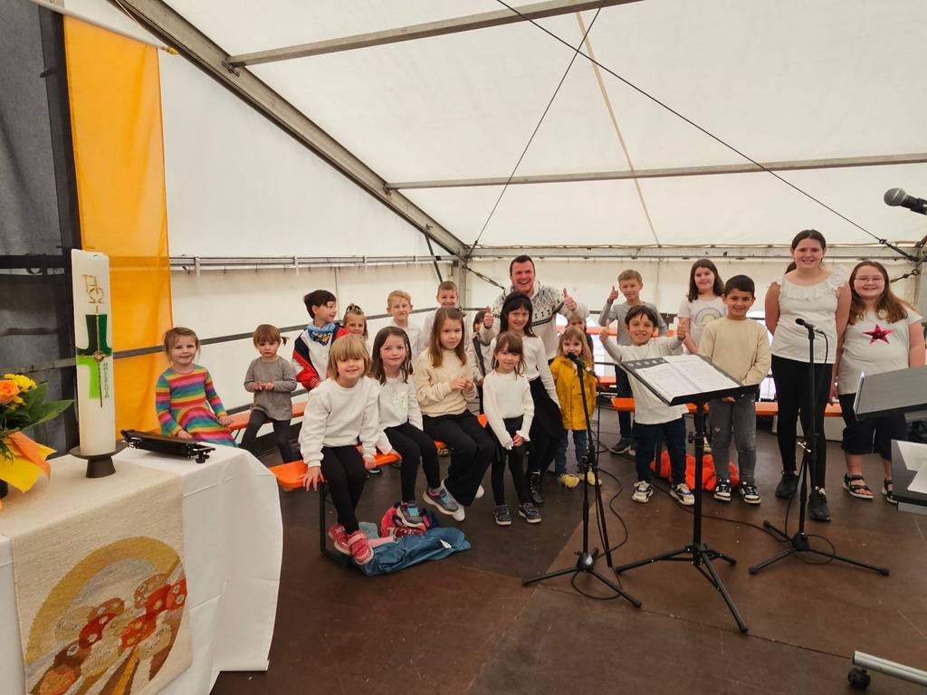Auch in diesem Jahr war das Festzelt am Hemsbacher Rathaus bereits zum Gottesdienst sehr gut gefüllt. Und wieder begeisterte ein Kinderchor aus verschiedenen Altersgruppen unter der Leitung von Dominique Wigand mit zahlreichen Bewegungsliedern die Besucher. Für die musikalische Begleitung sorgte auch eine Band aus Musikern unserer Gemeinde.