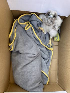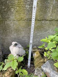 Am Dienstagnachmittag ist es uns endlich gelungen den kleinen Falken erneut ausfindig zu machen. Kurz darauf wurde er vom Falkner abholt, er wird jetzt in Sulzbach zusammen mit anderen Falken aufgezogen und ausgewildert werden.