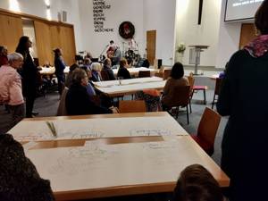Der Gottesdienstraum der EFG ist ungewohnt möbliert: 4 Tische-Inseln mit Stühlen drumrum und die Tische mit Papierbahnen belegt. Peer Müller erklärt uns nach der Begrüßung, was es damit auf sich hat: