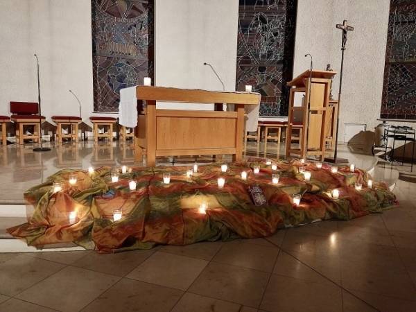 Die Stufen zum Altar sind mit Kerzen beleuchtet. Wir sitzen im halbrunden Stuhlkreis davor. Zwei Frauen führen uns durch die Gebetszeit.