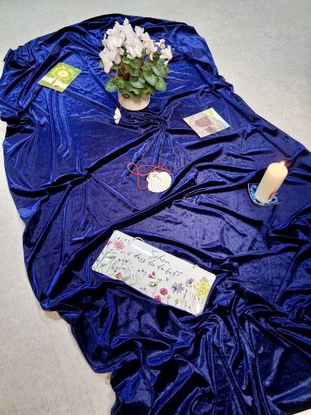 Wir sitzen im meditativen Stuhlkreis um das ansprechende und einladende Bodenbild in der Mitte.